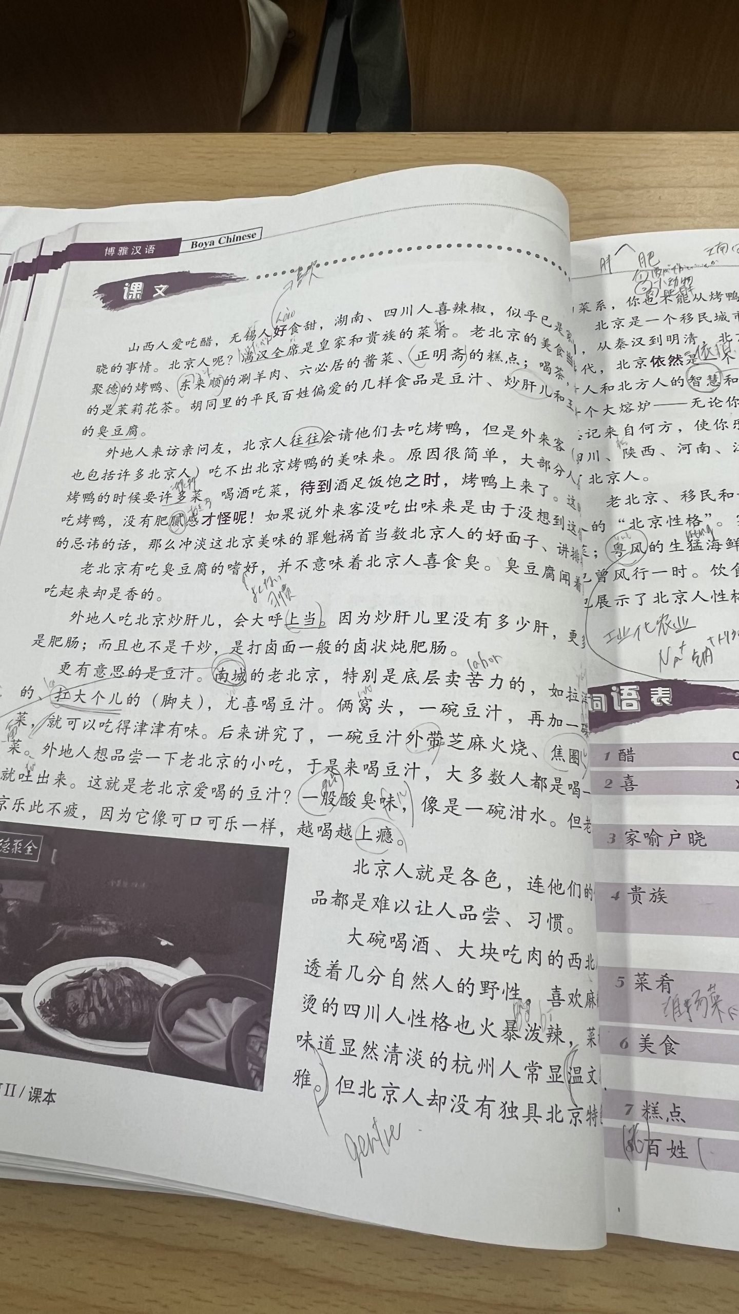 精読は、書面語(書面に使われる単語)が含まれることが多く、少し難しい単語が多いですが、先生がどういった場面で使用されるのか、また単語に関連する中国の事物の内容なども含めて教えてくださるので、単語だけではなく、中国に関わるあらゆることを学ぶことができるので、とても面白いです。最近の授業では、先生が中国で使われる古事成語をたくさん教えてくださりました。