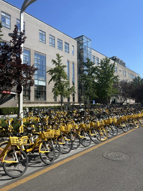 まず北京大学は敷地面積が270万平方メートルと、恐ろしく大きいです。およそ皇居の2倍以上にあたります。そのため一つ一つの建物が大きく、また道も広いです。私たちは基本的に東南門から入り、教室へ向かいます。大学生は徒歩の他、自転車や電動バイクに乗って通学しており、お昼の時間は特に人と乗り物で混雑しています。留学生活が始まってから衝撃だったのは、その広い道にきれいに整列されているシェアサイクル用の自転車の多さです。