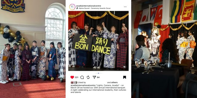 私たちが自主的に参加し、特に思い出に残っているイベントの一つにInternational Banquetがあります。さまざまな国にルーツをもつ学生が、歌やダンス、演奏などを披露する国際文化交流の場です。寮で仲良くなった友人が主催者だったこともあり、私たちは着物や浴衣を着て盆踊りを披露しました!大勢の前での発表に緊張もしましたが、日本の素敵な文化を少しでも伝えられたかなと思います。学内でAfter Partyも開かれ、イベント後にはたくさんの新しい友人ができました。勇気を出して皆で参加してよかったと心から思います!