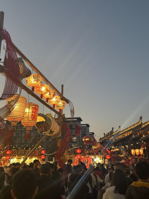 私はせっかくなら春節の雰囲気を感じてみたいと思い、上海蟠龙新天地で開催されていた庙会に行ってきました。会場には赤いランタンや春節の装飾が並び屋台や出店も多く、お祭りのような賑やかな雰囲気でした。伝統的な建物や水辺の景色と春節の装飾が組み合わさった景色がとても華やかで、夕方になると灯籠の明かりが一斉に灯り昼間とはまた違った雰囲気を楽しむ事もできました。上海でも春節のイベントが大きな賑わいを見せていることを実際に感じることができました。