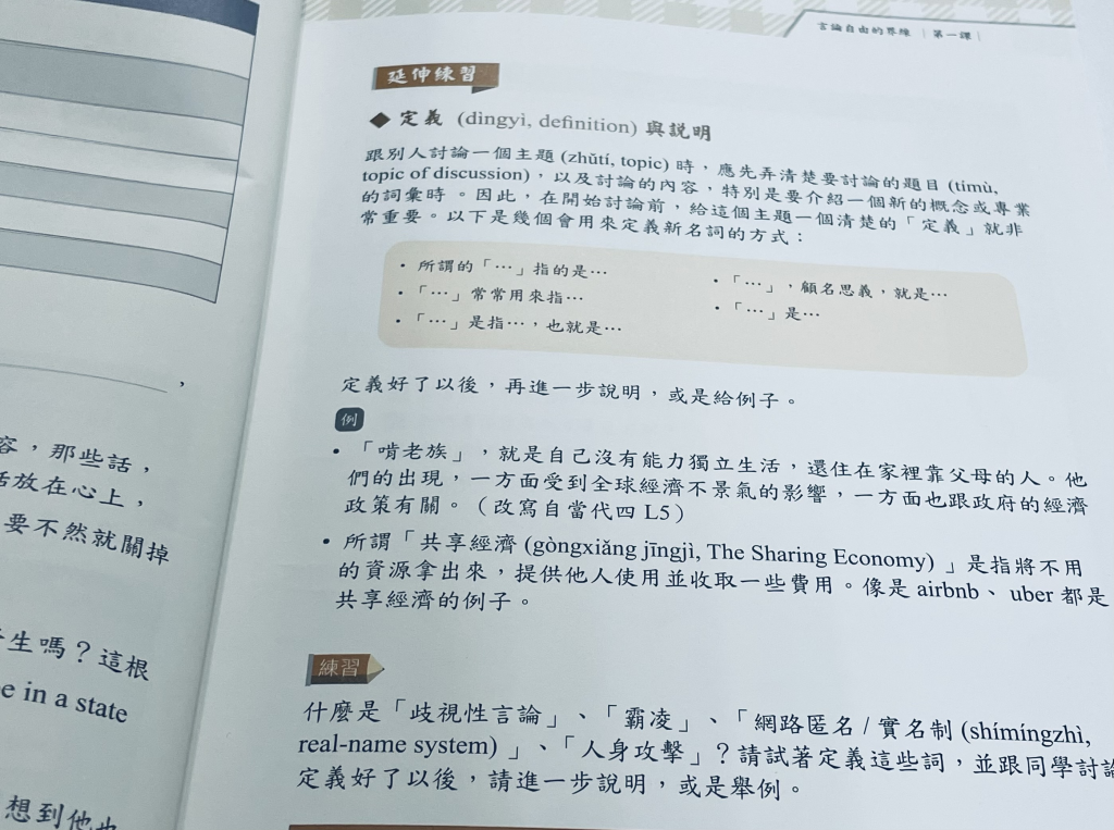 私の所属するクラスは今学期より新しい教科書に進み、これ迄の教科書とは違い、中国語を使った「議論」を重視する授業になりました。発表や議論の場で用いられる言い回しは、日常生活を送る上ではあまり見かけないものが少なくありませんが、私たちが自分の言いたいことを正しく伝達出来るようになるためにはとても重要なものです。